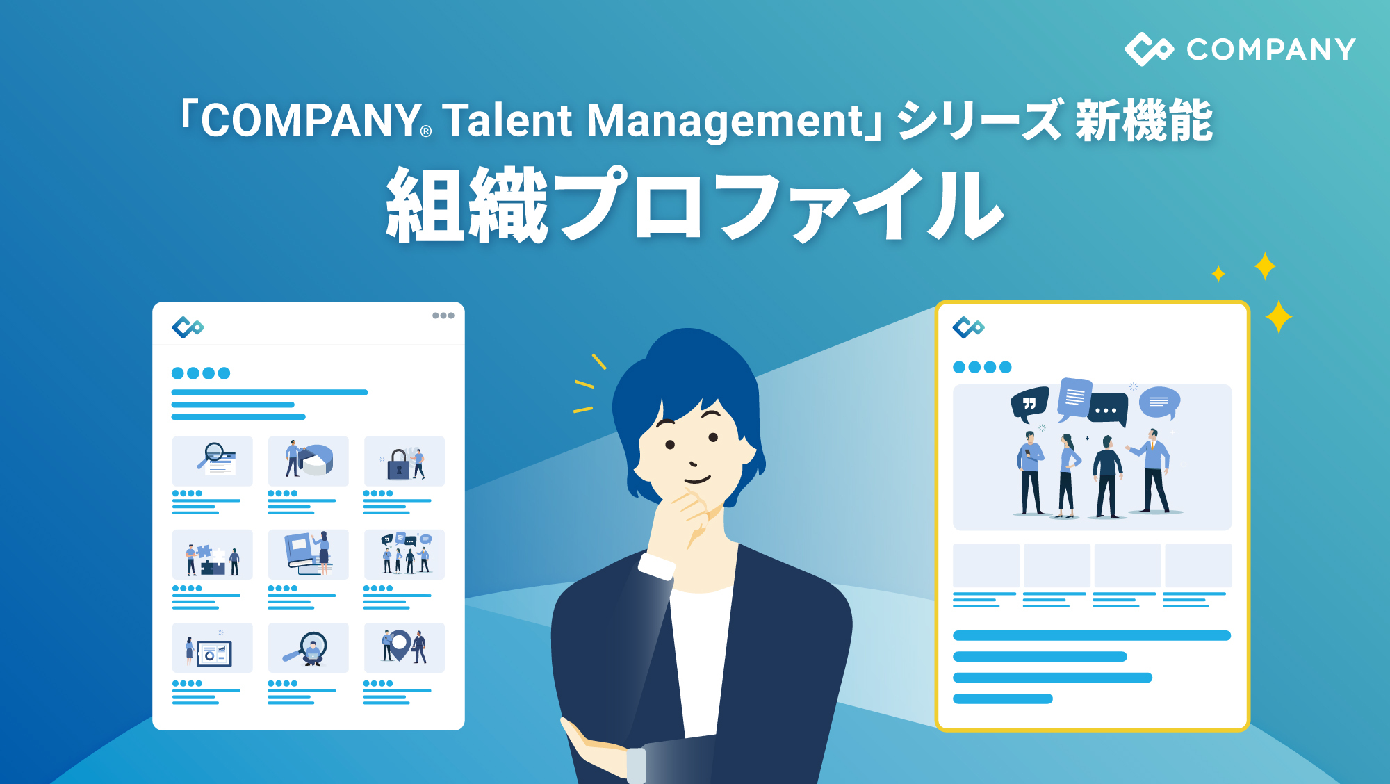 国内大手法人の3社に1社※が利用する統合人事システム「COMPANY」シリーズが提供する、日本法人固有の組織ニーズへ最適化したタレントマネジメントシステムです。人的資本経営に欠かせない人材の可視化、評価、育成、異動・配置、要員計画といったあらゆる機能を網羅しています。HR特化型生成AIの搭載と、現場の従業員から経営層までが迷わず操作できるUI/UXにより、はたらくすべての人が活用できる「COMPANY Talent Management」シリーズとして、組織の意思決定と個人の成長を同時に加速させます。