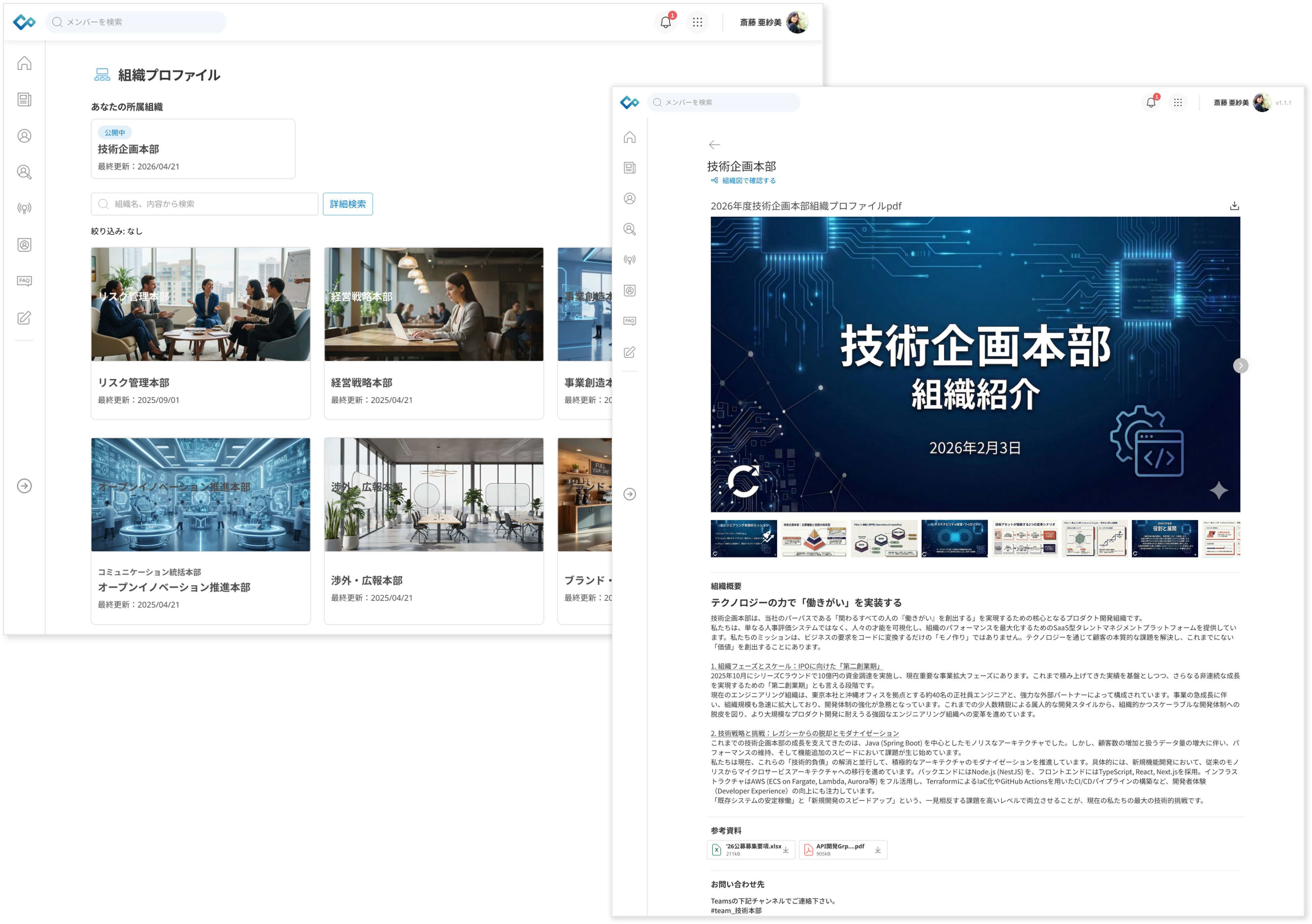 「組織プロファイル」機能では、各部署の「ミッション・ビジョン」や「実際の仕事内容」「求める人材像」など、組織図上の名称や階層構造だけでは把握しきれない「その部署が何を目指し、何をしているのか」という実態を、リッチテキストやスライドショー、参考資料の添付などを通じて社内に公開できます。